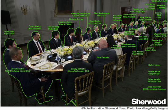 包括 OpenAI 创始人萨姆・奥尔特曼、微软、谷歌、苹果、Meta、甲骨文、Blue Origin、超威半导体、Palantir、美光科技、Shift4等科技巨头高管在内的二十余位行业领袖参会。
