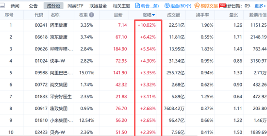 大型科技龙头表现不俗,港股互联网ETF(513770)成分股中,阿里健康、京东健康领涨;哔哩哔哩-W涨逾5%,快手-W涨超4%,阿里巴巴-W涨逾3%,小米集团-W涨超2%,腾讯控股涨逾1%,续创年内新高。